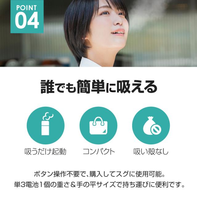 吸う動作だけで起動してくれて吸い殻もナシ。軽量かつコンパクトなのでポケットに収納したり、持ち運びにも便利です。