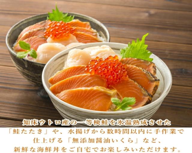 知床ウトロ産の一等検鮭を氷温熟成させた「鮭たたき」や、水揚げから数時間以内に手作業で仕上げる「無添加醤油いくら」など、新鮮な海鮮丼をご自宅でお楽しみいただけます。