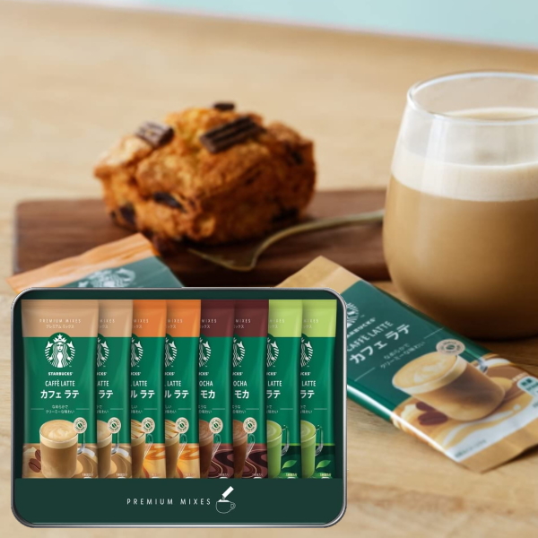 内容:スターバックスプレミアムミックス(カフェラテ18g×2、キャラメルラテ23g×2、抹茶ラテ24g×2、カフェモカ22g×2)(スティック)【缶入】