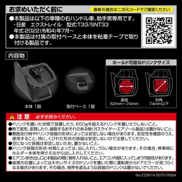 T33系エクストレイル(2022(令和4)年7月〜)の右ハンドル車、助手席側専用に設計・デザインされたドリンクホルダーです。