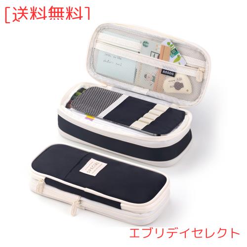 【マチ付くなデザイン】身中のファスナーを開ければ、マチ付きデザインになり、展開で広がる拡張式。見開き式になるので、中身が見やすく、消しゴムや修正テープなど、小さいものも取り出しやすく便利です。ふせんや定規などを分けて収納できるポケットがついています。 筆記具などと分けて収容できます。