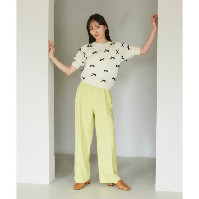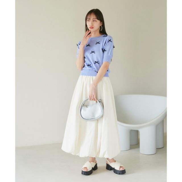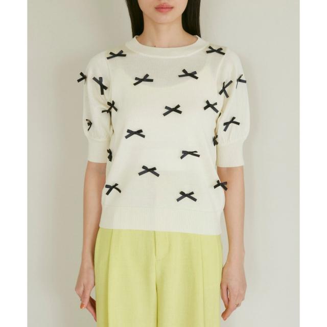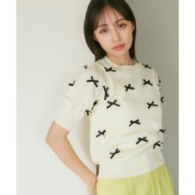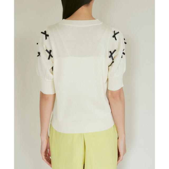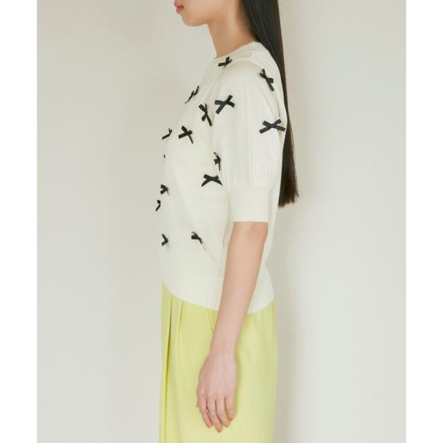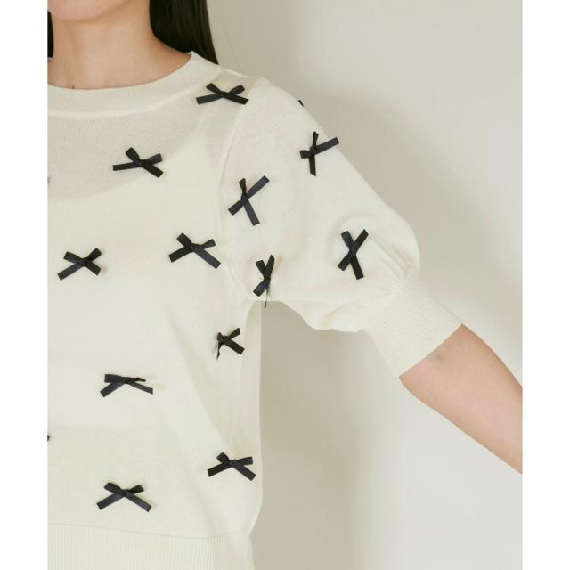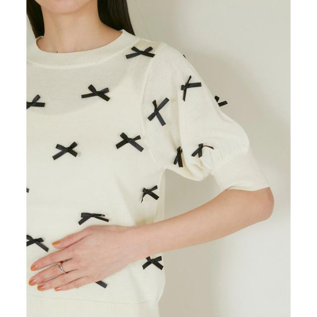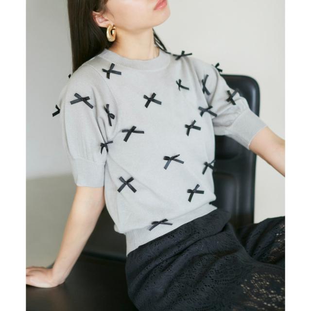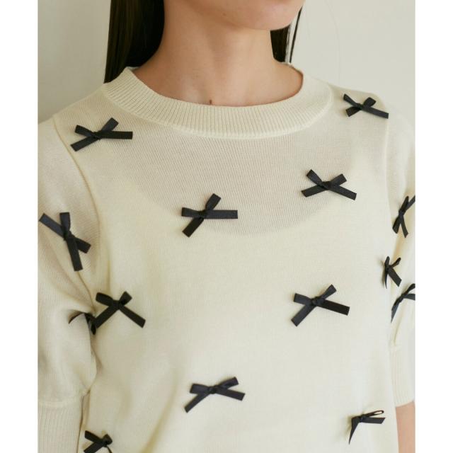 トレンドのリボンのモチーフをサテンリボンでデザインしたハーフスリーブニット。