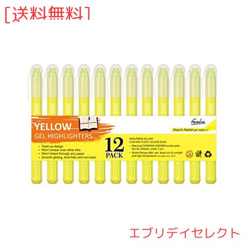 Feela 固形蛍光マーカー 蛍光ペン イエロー 12本セット 繰り出し式 黄色い ゲルインク 教科書/ノード/新聞/手帳にマーキング 色塗り 子供