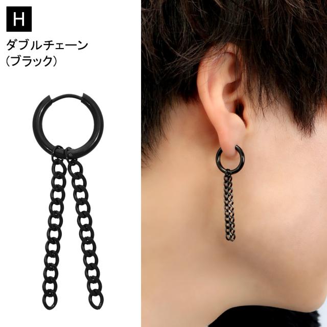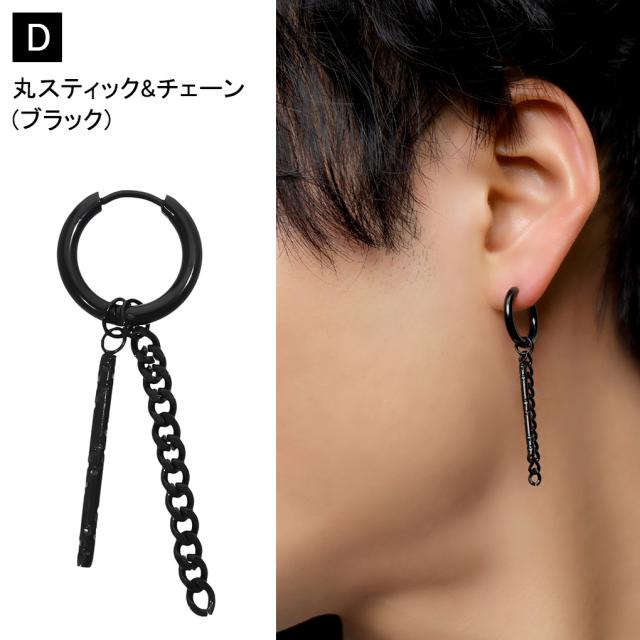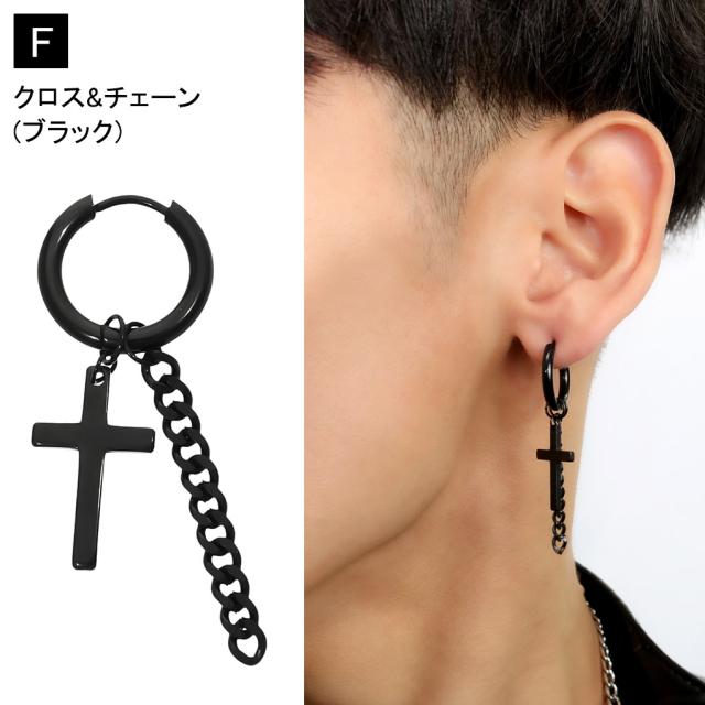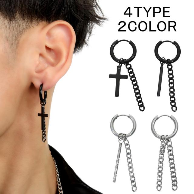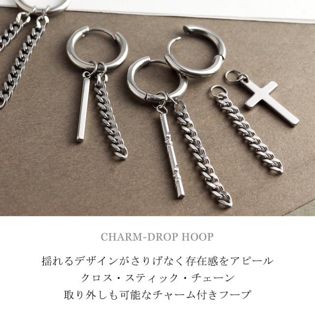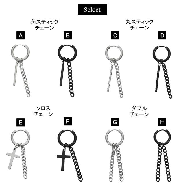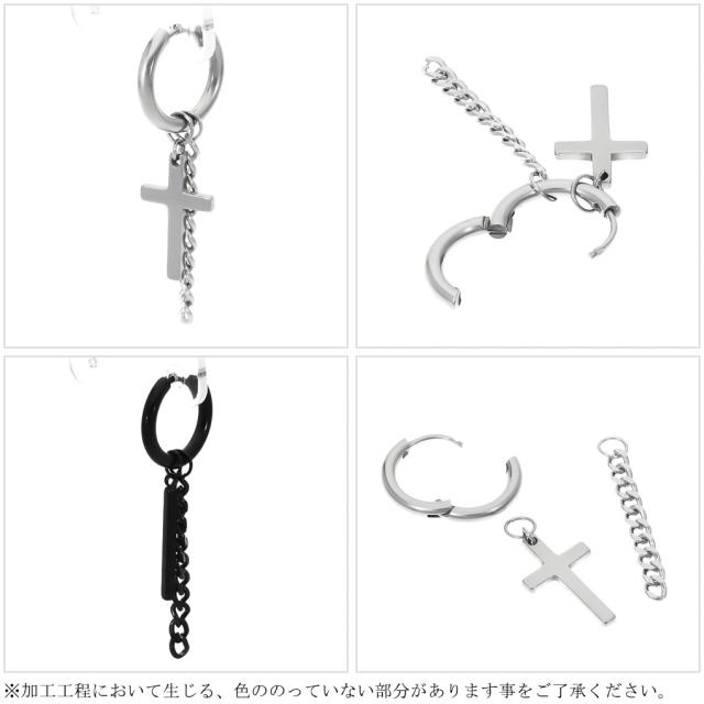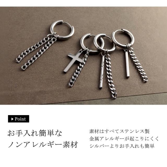 フープピアス チャーム ドロップ チェーン ピアス 1P 片耳用 ステンレス 揺れる ブラック 黒 喜平チェーン スティック バー クロス 十字架 キヘイ