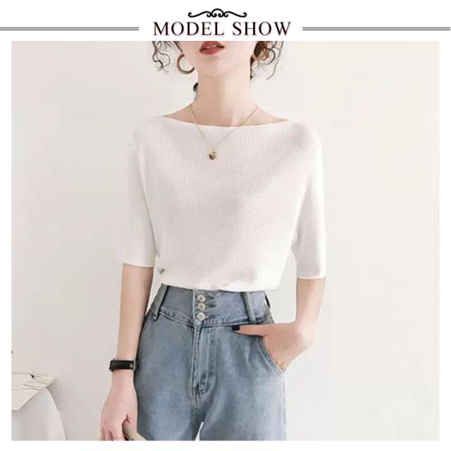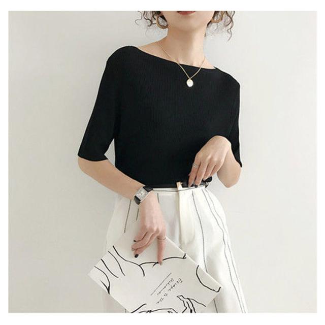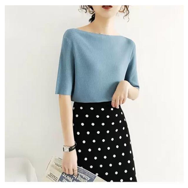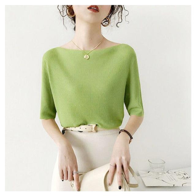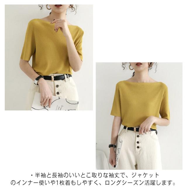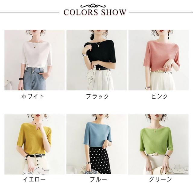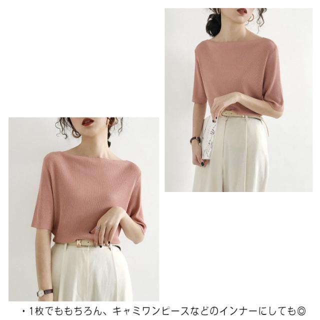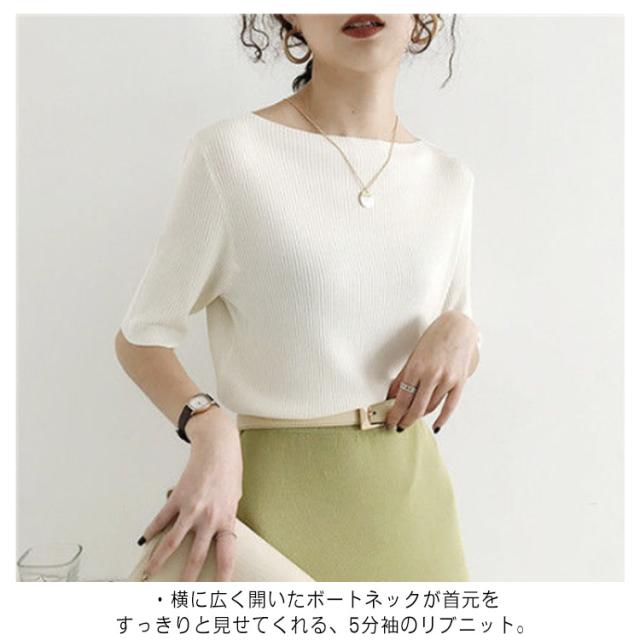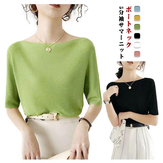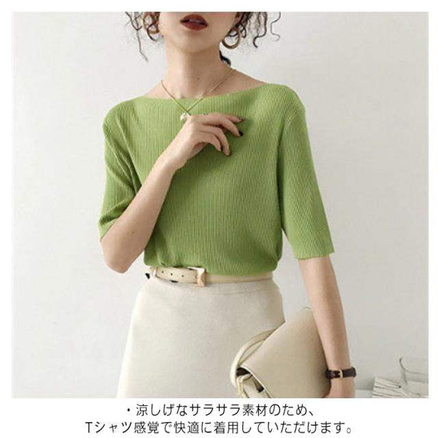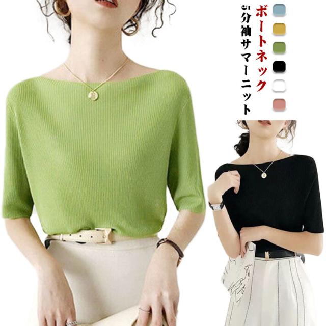 五分袖 プルオーバー レディース リブ シンプル ニット Tシャツ ニットソー サマーニット 洗えるニット カットソー ボートネック ニットトップス Tシャツ 涼しい オフィスカジュアル きれいめ 春