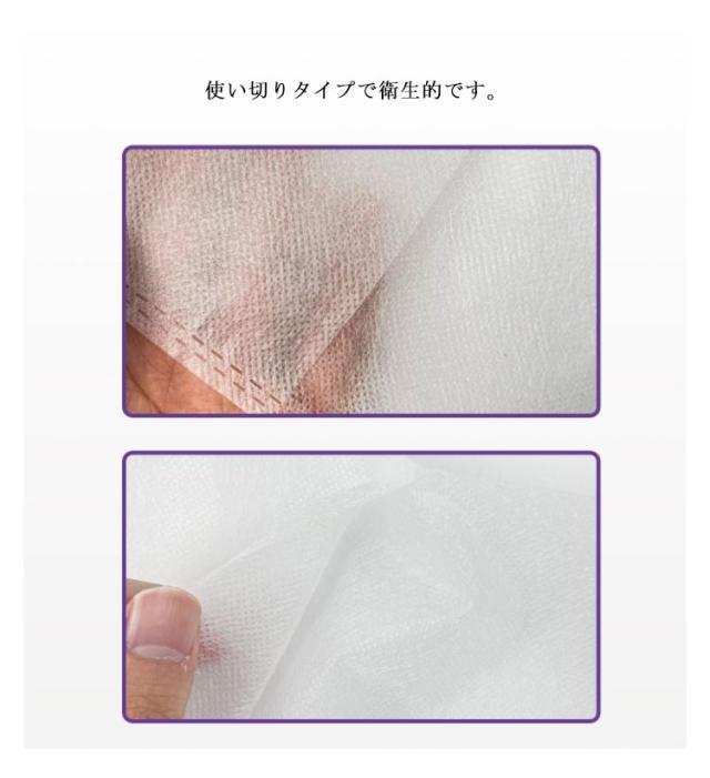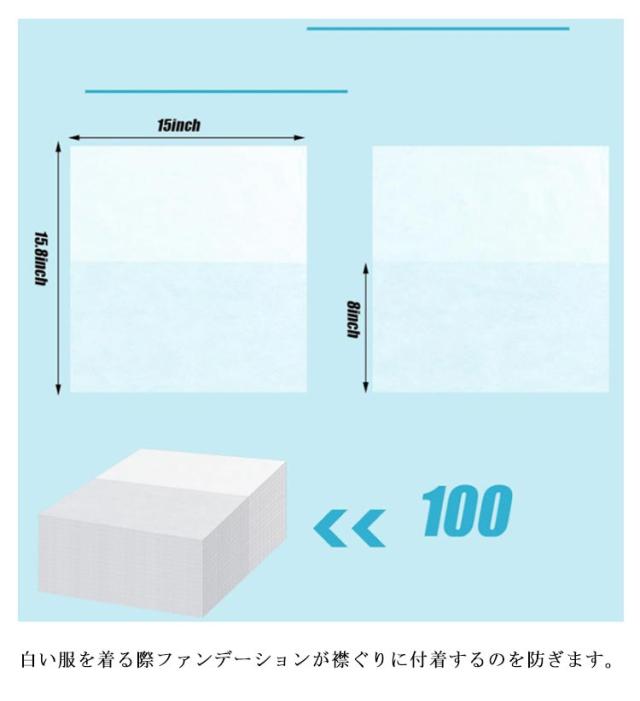 | 100枚セット!試着やお着換え時にメイク付着を防止するフェイスカバーです! メイク後の着替え時も洋服を汚れから守ります。 肌触りが優しく柔らかい不織布素材です。 白い服を着る際ファンデーションが襟ぐりに付着するのを防ぎます。 使い切りタイプで衛生的です。 アパレルショップでの試着や、自宅や職場での着替え時等様々なシーンで活躍します | |