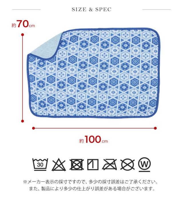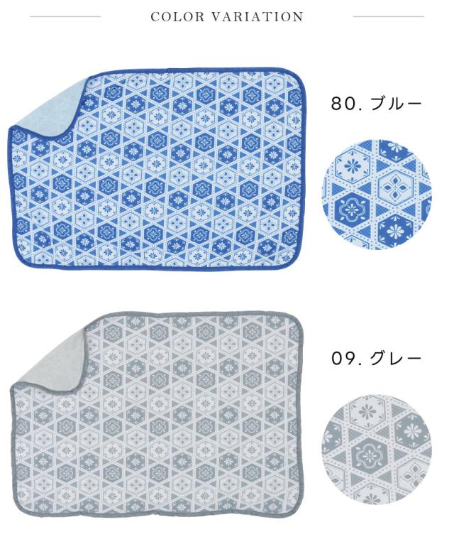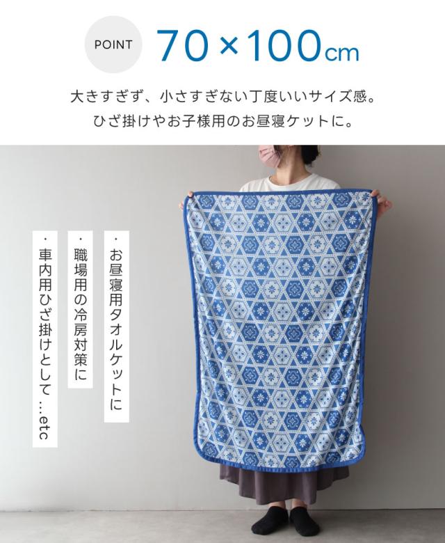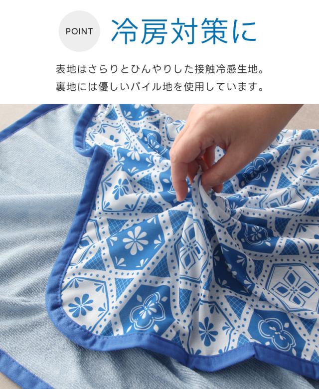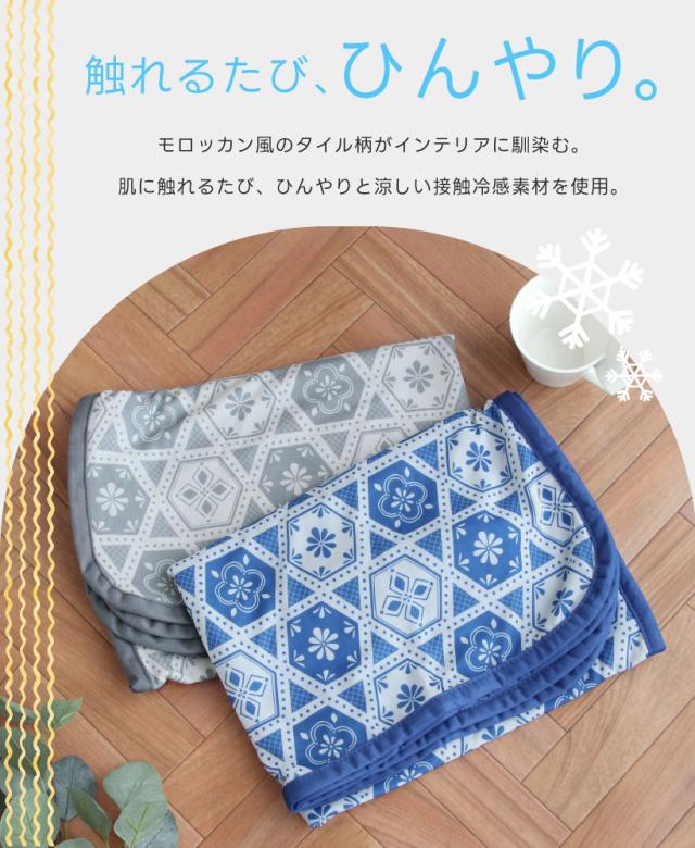 ひんやり冷たい接触冷感のブランケット。タイル柄がおしゃれな、インテリアにもよく馴染むデザイン。裏地は肌触りの優しい、パイル素材を使用。職場での冷房対策や、お昼寝のタオルケットとしても◎ 暑い日もひんやり素材でリラックス。