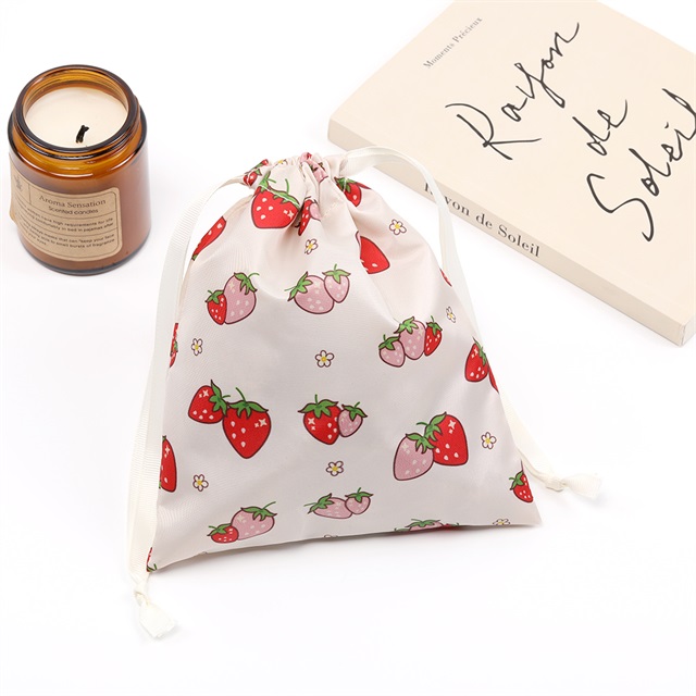 いちご柄巾着袋 収納袋 小物入れ お菓子入れ ナプキン入れ アクセサリー入れ いちごモチーフ 苺柄プリント