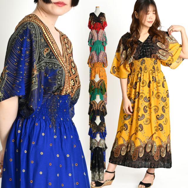 ワンピース 春 夏 レディース 半袖 ロング ロング丈 マキシ丈 シャーリング ワンピ ピーコック 孔雀 ペイズリー 柄 rd61031 ロングワンピース 半袖ワンピース 大きいサイズ ゆったり