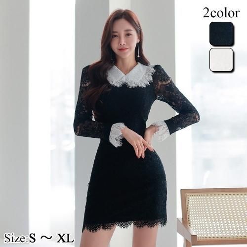 【グラシア】 キャバ ドレス キャバドレス ワンピース ミニドレス シルエット バイカラー すっきり 大人 総レース ミニ丈 透け感 レース アイラッシュレース ブラック ホワイト S M L XL