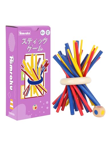 【材質・仕様】:高級な樺の木で作られ、適度な重さで手触りがとても良く、安全の塗料を採用し特殊マット仕上げで安心・安全に繋ぎます。セット内容:青スティック(大)9本、赤スティック(中)9本、黄色スティック(小)9本、木の輪1個、サイコロ1個、収納ケース1個。パッケージサイズ:23cm×10.5cm×3cm。対象年齢:6歳以上。