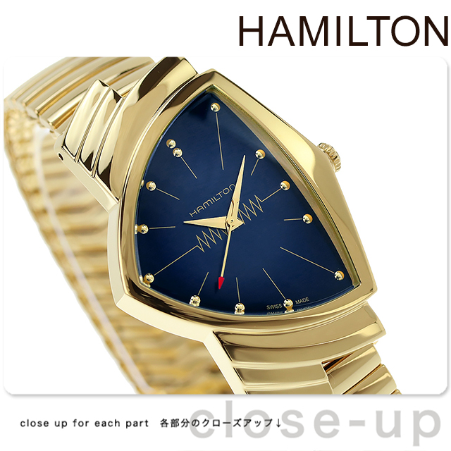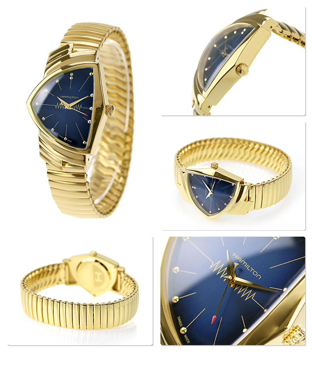 3年保証キャンペーン ハミルトン ベンチュラ 32.3mm スイス製 メンズ 腕時計 H24301141 HAMILTON VENTURA アナログ ブルー ゴールド ◆HAMILTON(ハミルトン)はアメリカ発祥の老舗ブランドです。創業翌年に誕生した懐中時計「ブロードウェイ・リミテッド」は、他の時計よりも正確に時を刻むことから鉄道用時計として採用されました。その後も航空用時計や軍用時計として採用されるなど、品質の高さと流行にながされない独自のデザインが世界中の人々に支持されています。 時計史上の革命児「ベンチュラ」。エルヴィス・プレスリーの大ヒットシングル『ブルー・スエード・シューズ』にインスパイアされたモデル。ニッケルの時針、分針、秒針を備え、高い信頼性を誇るクォーツムーブメントを搭載しています。