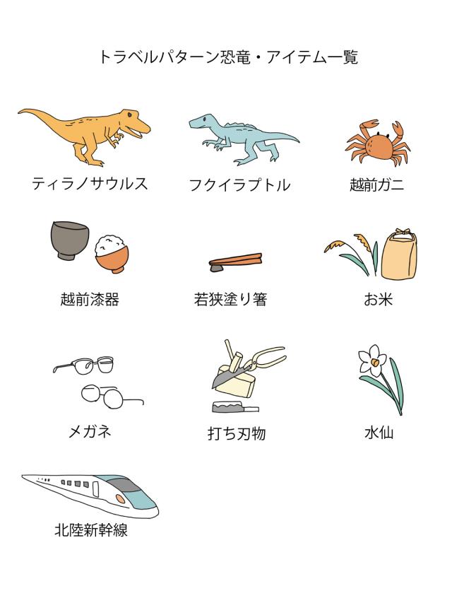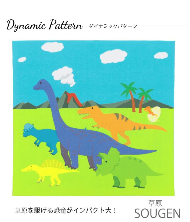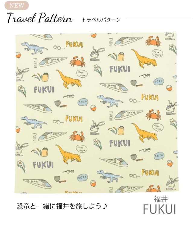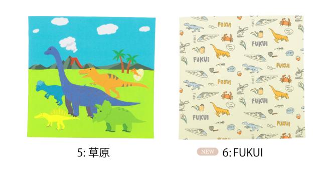 シルエットがかっこいい切り絵パターンとつぶらな瞳がユーモアでかわいいポップパターン、草原を駆ける恐竜たちがインパクト大なダイナミックパターン、恐竜といっしょに福井をめぐるトラベルパターンの4種類からお選びいただけます。 ぜひお気に入りの恐竜を見つけてみてください。