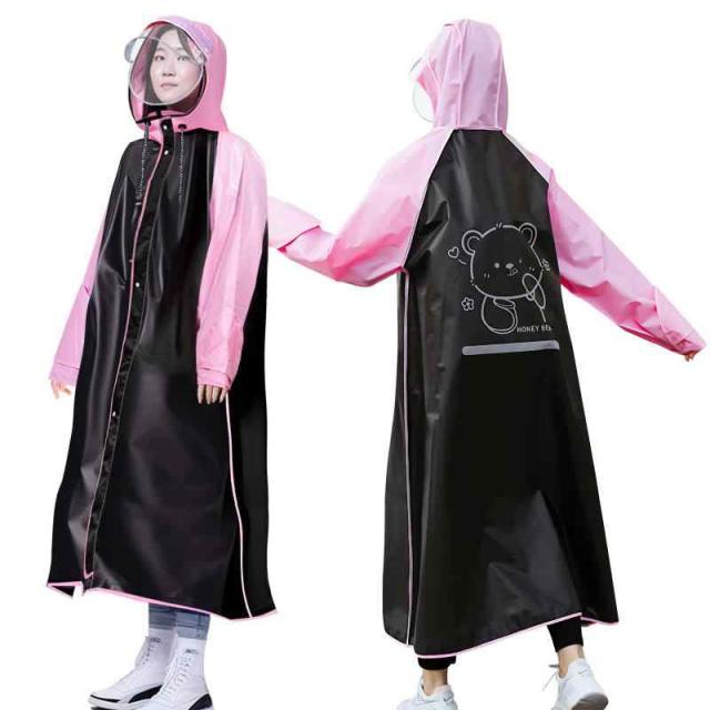 [Hyshuker] レインコート 自転車 リュック対応 レインウェア 安全反射テープ付き ロング丈 かわいい 雨具 防水 防風 軽い フェイスカバー付き レインポンチョ 通勤 通学 男女兼用 ブラック+ピンク XL