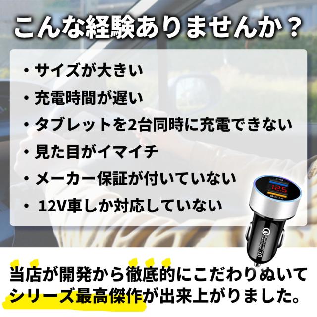 長時間のドライブ中に、スマホの充電が切れてしまった…! 地図アプリが使えない、家族と連絡が取れない…そんな不安を経験したことはありませんか? もうそんな心配は不要です! この車載充電器があれば、 2台のスマホを同時に急速充電 できるので、充電切れの不安から解放されます。 【充電の心配から解放され、心置きなくスマホを楽しめる】 カーチャージャーは、2つのUSBポートを搭載。最大3.1Aの出力で、スマホを2台同時に急速充電できます。 充電切れの不安から解放され、ドライブ中に動画を見たり、音楽を聴いたり、ゲームを楽しんだり、心置きなくスマホを活用できます。 【 電圧表示LEDでバッテリー状態を常に把握】 本体前面には、電圧表示LEDを搭載。車のバッテリー電圧をリアルタイムで確認できます。 電圧低下によるトラブルを未然に防ぎ、安心してドライブを楽しめます。 【 夜間も安心のブルーLEDライト】 カーチャージャーは、夜間でも充電状況を視認しやすいブルーLEDライトを搭載。 車内をスタイリッシュに演出するだけでなく、暗い車内でもケーブルの抜き差しをスムーズに行えます。 【12V&24V車対応で、幅広い車種で使用可能】 普通自動車はもちろん、トラックなどの大型自動車にも対応。 車種を問わず、あらゆる場面で活躍します。 【高性能チップ採用で、安全・安心に充電】 過熱防止、過電流、過負荷、ショート、過電圧、不足電圧に対する保護機能を搭載。 大切なデバイスを安全に充電できます。 さらに、コンパクトなデザインで持ち運びにも便利。 カラーバリエーションは、ブラック、ブルー、シルバー、ゴールドの4色展開。 あなたの愛車にぴったりのカラーを選んでください。 カーチャージャーは、あなたのカーライフをより快適でスマートなものにします。 【商品仕様】 サイズ:約幅3.1×奥行き6.2×高さ3.1cm パッケージ約幅8.1×奥行き3.0×高さ17cm(最大部 出力電圧:DC5V 出力電流:最大3.1A(2ポート合計) 入力電圧:12V・24V車対応 機種対応:USBケーブルでの充電 iPhone・iPadシリーズ・Android・USB充電対応タブレット・PC USB充電対応のゲーム機など 【注意事項】 ※本商品には説明書が付属しておりません。使用方法に関しては商品ページをご参照ください。 ※商品画像はご覧になっているモニターやPCなどの環境、解像度により、実物と多少カラーが異なる場合がございます。 色味やサイズが異なるなどのクレームはご対応致しかねますので、予めご了承ください。 ※輸送中に外装に傷やへこみが起こる場合がございますが、商品に影響はございませんので、予めご了承のもとお買い求めください。 ※本商品は海外からの輸入品ですので、細かい傷や汚れなどある場合がございます。予めご了承のもとお買い求めください。 ※こちらの商品は安価にご提供するため、簡易包装、簡易パッケージとなっております。 ※本商品を使用した事による、直接もしくは間接的に生じた損害、データの破損、事故、怪我について当店は一切の責任を負いません。 ※夏季の閉め切った車内、長時間直射日光のあたる場所や極端な低温の場所に放置すると、故障の原因になる場合があります。 使用しない時は、シガーソケットから商品を取りはずし、常温の場所に保管ください。 ※本商品は電波法令で定められている技術基準に適合していることを証明する技適マークが貼付されていない無線機器であり、 日本国内で使用する場合は電波法違反になる恐れがございます。 ご使用の際には、十分ご注意下さいますようお願いいたします。 詳しくは、最寄りの総務省総合通信局へお問い合わせ下さい。 ※お車のシガーソケット経由で充電を行う際は、必ずエンジンスタート後に接続を行い充電を行ってください。 ※本体や付属品が水に濡れると故障の原因となりますので、汚れた場合はウェットティッシュや濡れタオルを使って汚れを拭き取ってください。 ※お子様の使用は事故、怪我の原因となりますので、手の届かない場所にて保管頂き、ご使用はお控えください。 ※本商品はすべての環境、機器との接続を保証するものではございません。一部のBluetooth機器では環境、 相性等により接続できない場合がございます。予めご了承ください。 ※運転中は、危険ですので絶対に使用しないでください。交通事故の原因になりますので、ご注意ください。 ※耳を刺激するような大きな音量で長時間続けて聞くと、聴力に悪影響を与えることがあります。 耳を守るため、音量を上げすぎないようご注意ください。 |