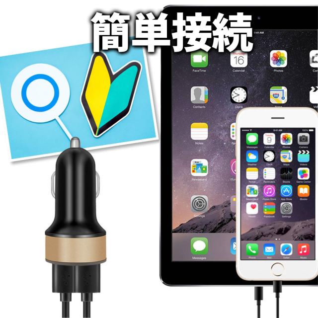 この車載充電器があれば、 2台のスマホを同時に急速充電 できるので、充電切れの不安から解放されます。