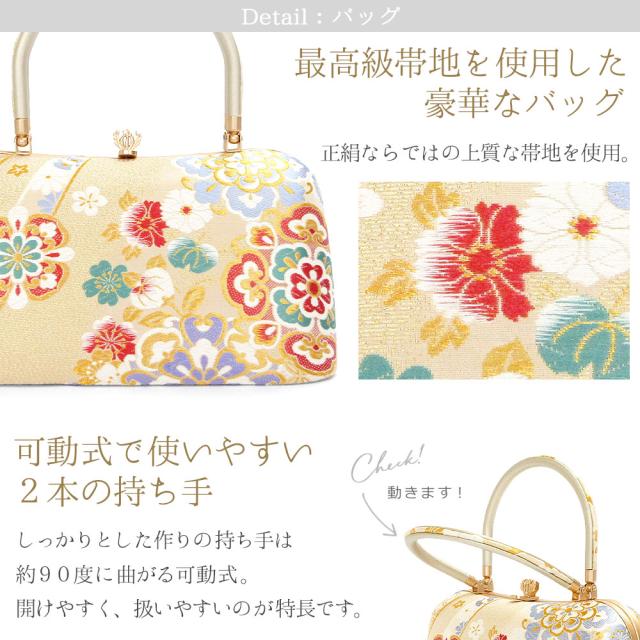 正絹帯地を使用した高級感のあるバッグに可動式の2本の持ち手を付け、より豪華なバッグに仕上げました。