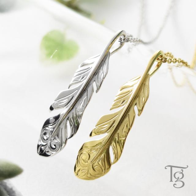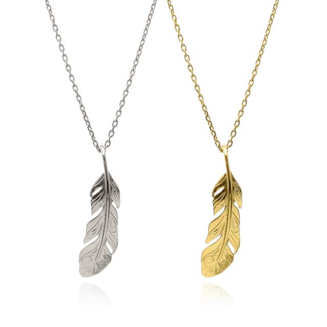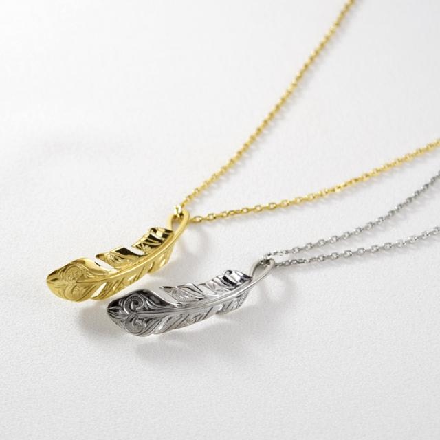 フェザーデザインに繊細なハワイアン柄を施したペアネックレス。 男性用はスティールシルバーカラー、女性用はイエローゴールドカラーの仕様です。