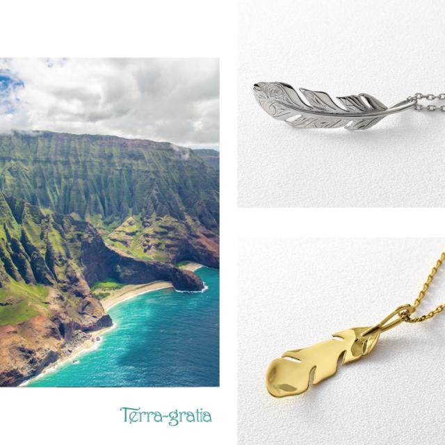 フェザーデザインに繊細なハワイアン柄を施したペアネックレス。