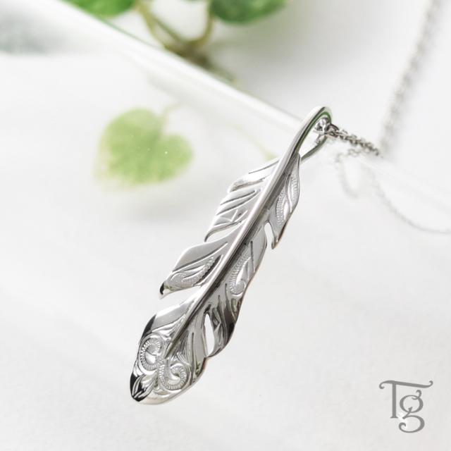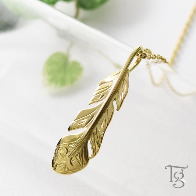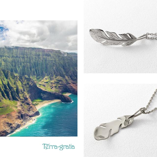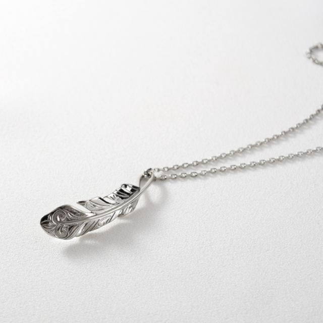 フェザーデザインに繊細なハワイアン柄を施したネックレス。