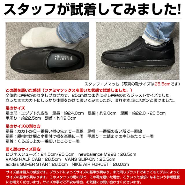 普段着用するビジネスシューズ(26.5cm 3E)よりワンサイズ下の26.0cmを選びました。