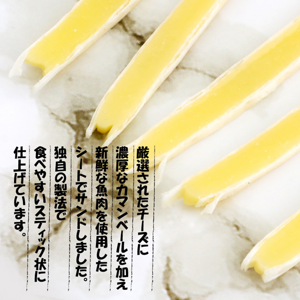 原材料名 :プロセスチーズ(ナチュラルチーズ)(国内製造)、魚肉加工品(魚肉すり身(魚肉、砂糖)、でん粉、植物たん白、その他)/乳化剤、加工デンプン、ソルビトール、調味料(アミノ酸等)、(一部に乳成分・小麦・大豆を含む)