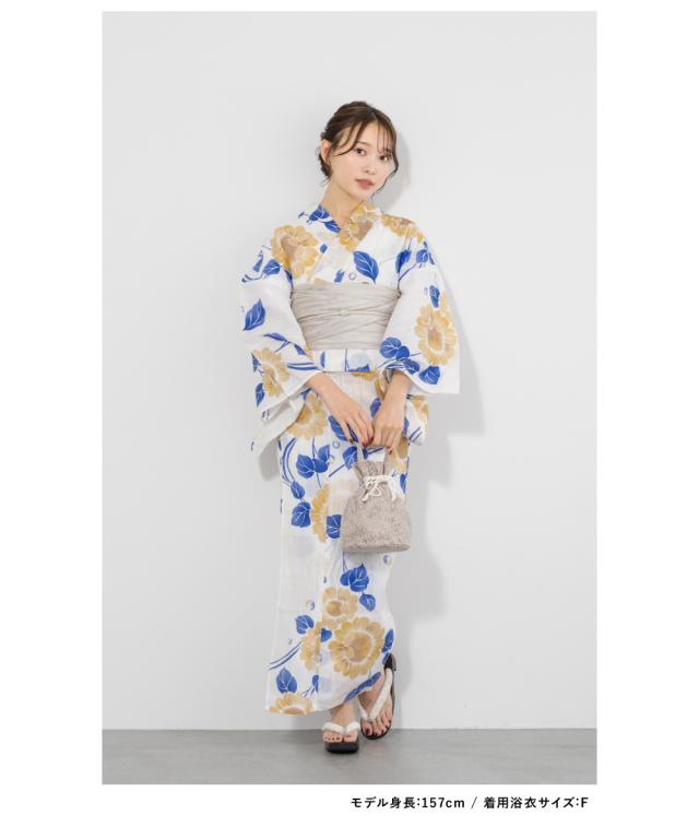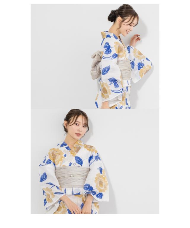 新作コーデ!bonheur saisons 浴衣セットです。 内容は【浴衣・帯・下駄】の3点セットです。 浴衣生地は、通気性と吸湿性に優れシワにもなりにくい綿麻混紡です。 仕立て上がりですので、お届け後すぐにお召しいただけます。