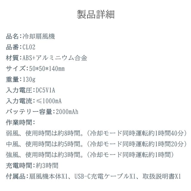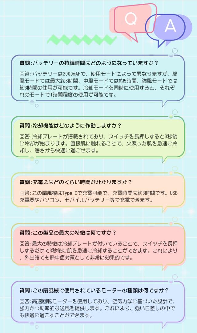 Q1: バッテリーの持続時間はどのようになっていますか? A1: バッテリーは2000mAhで、使用モードによって異なりますが、弱風モードでは最大約8時間、中風モードでは約5時間、強風モードでは約3時間の使用が可能です。冷却モードを同時に使用すると、それぞれのモードで1時間程度の使用が可能です。 Q2: 冷却機能はどのように作動しますか? A2: 冷却プレートが搭載されており、スイッチを長押しすると3秒後に冷却が始まります。直接肌に触れることで、火照った肌を急速に冷却し、暑さから快適に過ごせます。 Q3: 充電にはどのくらい時間がかかりますか? A3: この扇風機はType-Cで充電可能で、充電時間は約3時間です。USB充電器やパソコン、モバイルバッテリー等で充電できます。 Q4: この製品の最大の特徴は何ですか? A4: 最大の特徴は冷却プレートが付いていることで、スイッチを長押しするだけで3秒後に肌を急速に冷却することができます。これにより、外出時でも熱中症対策として非常に効果的です。 Q5: この扇風機で使用されているモーターの種類は何ですか? A5: 高速回転モーターを使用しており、空気力学に基づいた設計で、強力かつ効率的な送風を提供します。これにより、強い日差しの中でも快適に過ごすことができます。 |
