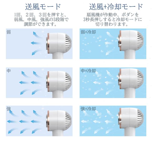 【強力送風&3段階風量調整】ドローンにも使われる高速回転モーターを採用し、空気力学に基づいた超小型ヘッドは風力の分散を抑え、力強く送風し、6枚羽根に加え、超ミニファンでありながらも風力アップして、涼しい風を届けてくれます。風力を弱?中?強の3段階から切り替えられ、心地の良い自然風でモワッとした熱気を吹き飛ばして います。冷却機能と併用するとさらに涼しい!暑苦しい夏も涼しく快適です。