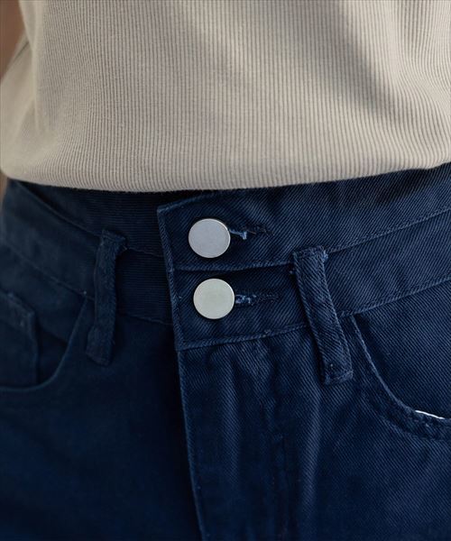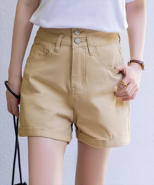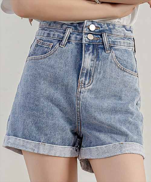 レディース ハイウエストロールアップでブルボタンショートデニムパンツ