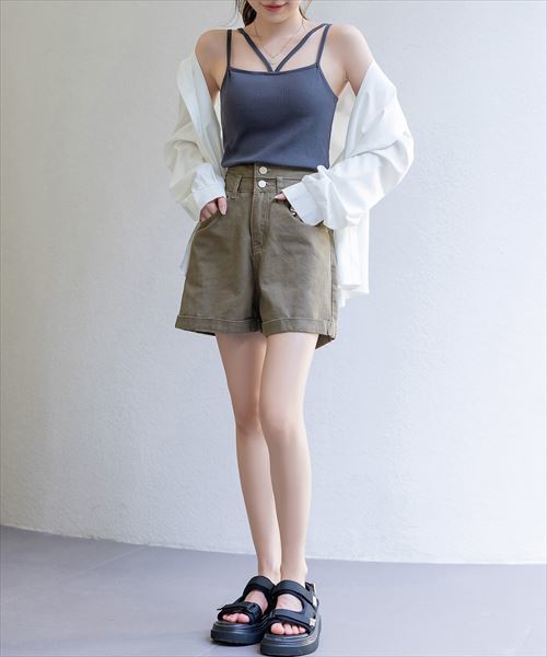 テディショップ(TeddyShop)/レディース ハイウエストロールアップでブルボタンショートデニムパンツ