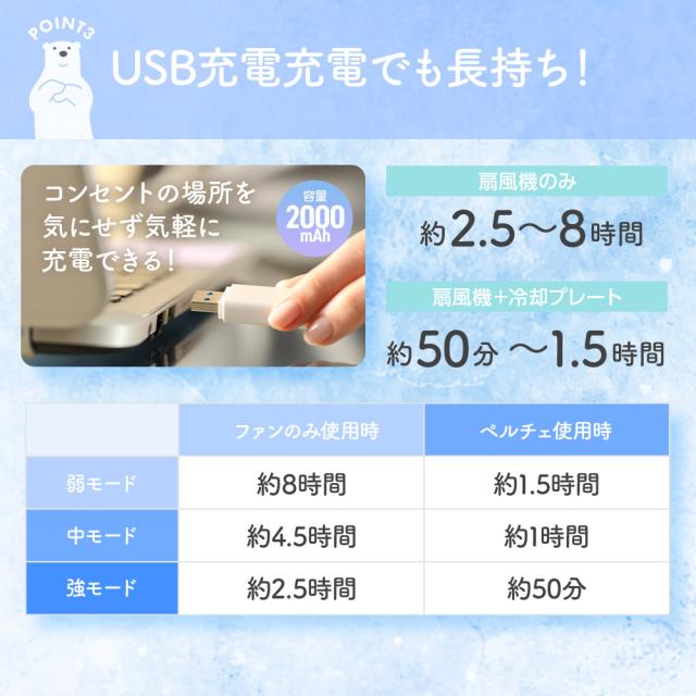 使用時間 :ファンのみ / 約2.5〜8時間(使用環境によって異なります)