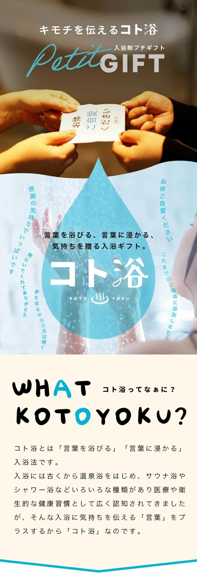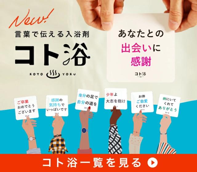 「言葉を浴びる」「言葉に浸かる」「言葉を贈る」を融合させた新「浴感」※ 。入浴には古くから温泉浴をはじめ、サウナ浴やシャワー浴などいろいろな種類があり医療や衛生的な健康習慣として広く認知されてきましたが、そんな入浴に気持ちを伝える「言葉」をプラスするから「コト浴」なのです。 日持ちがするから贈る時期を選ばず、プチプラギフトとしても手頃でそのまま渡してもかわいいパッケージ、 贈らない理由が見当たらないほどオススメしたいお風呂のソムリエ(バスリエ)からの提案です。※浴感とは色や香り、とろみ、炭酸、肌触りなど湯に浸かったときの感触のことです。食事の際に感じる食感のようなものです。