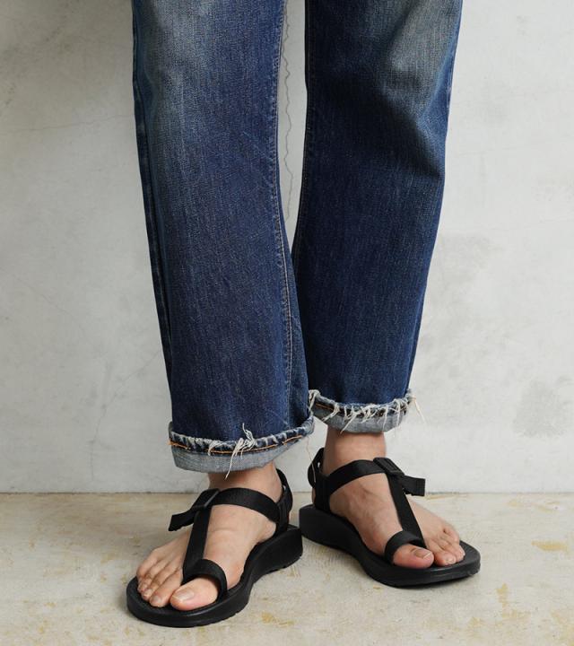 鼻緒部分のウェビングトゥループは可動調整でき、ホールドストラップ部分で足首にフィットして脱げにくくなっています。また、インジェクションモールドのラダーロックバックルで、ウェビングの調整をスムーズにしています。