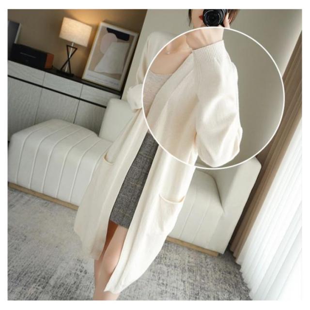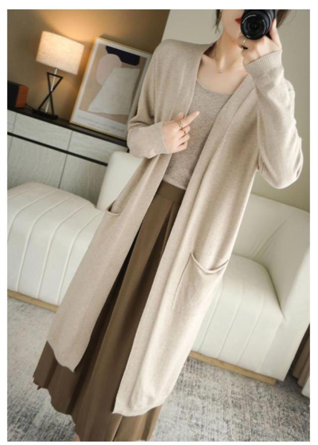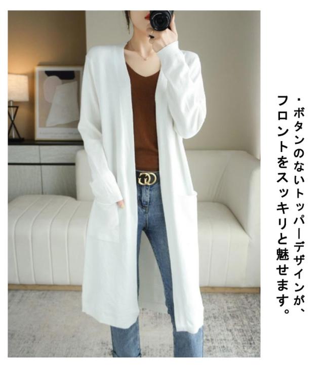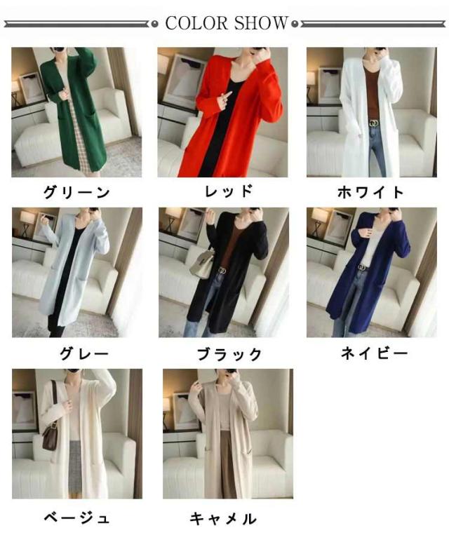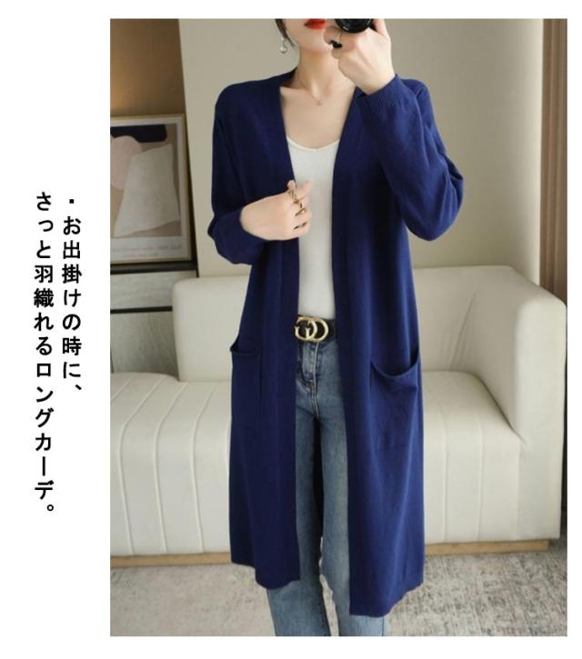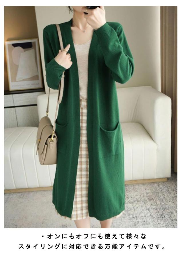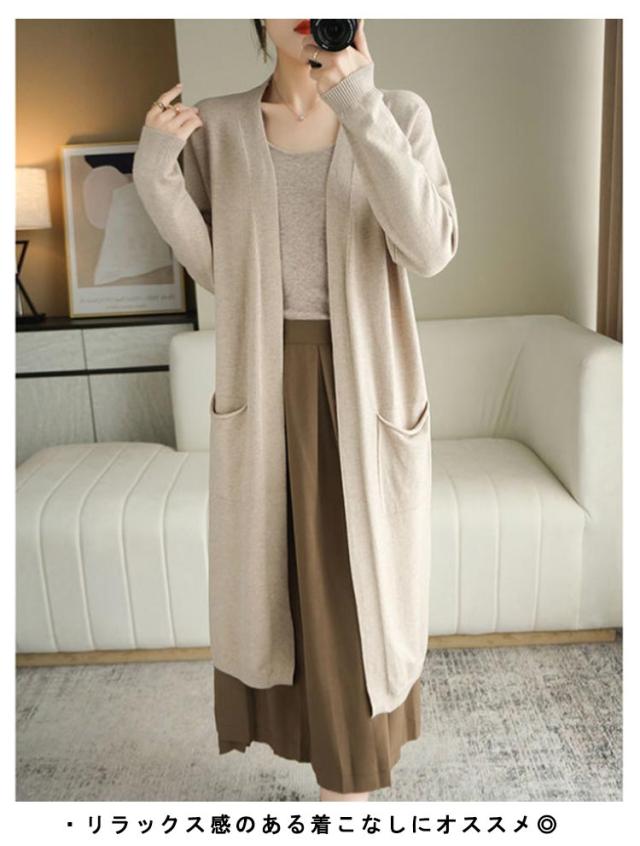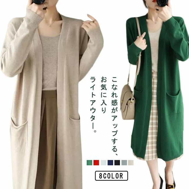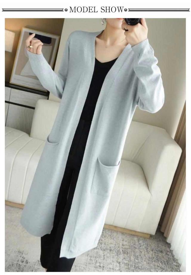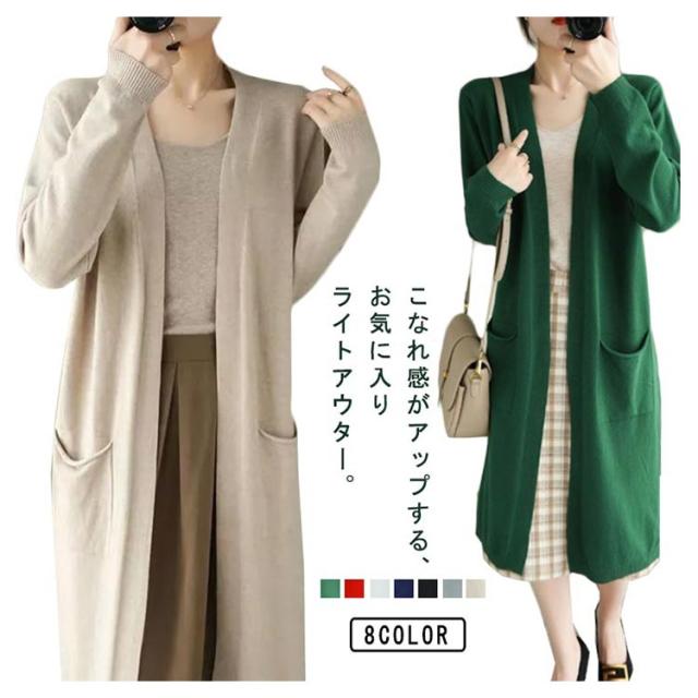 ロングカーディガン レディース ニット カーディガン ロング丈 長袖 前開き 羽織り ボタンなし ポケット付き ゆったり 春 秋 無地 全8色