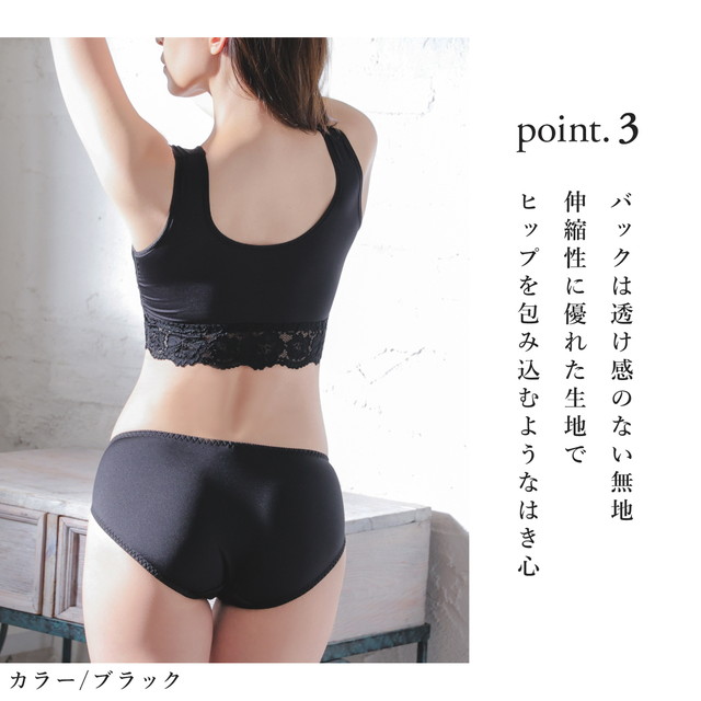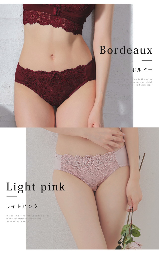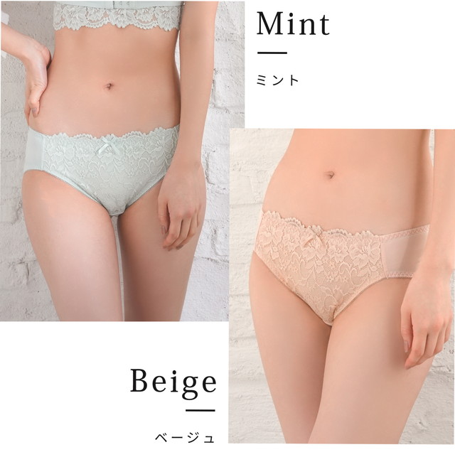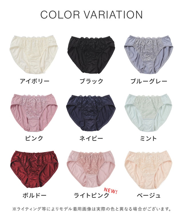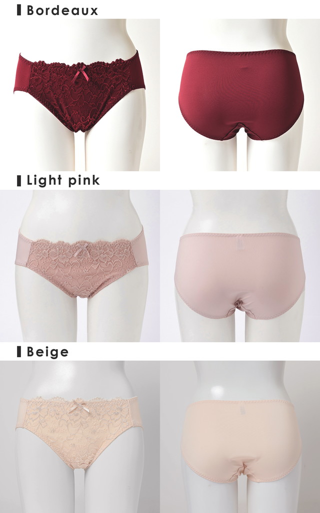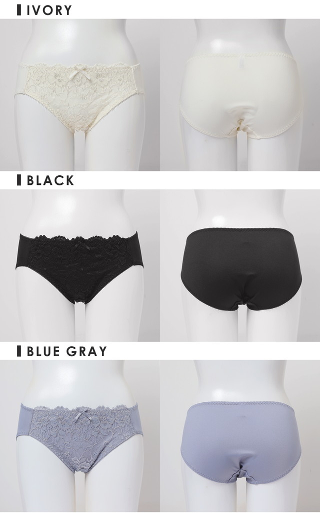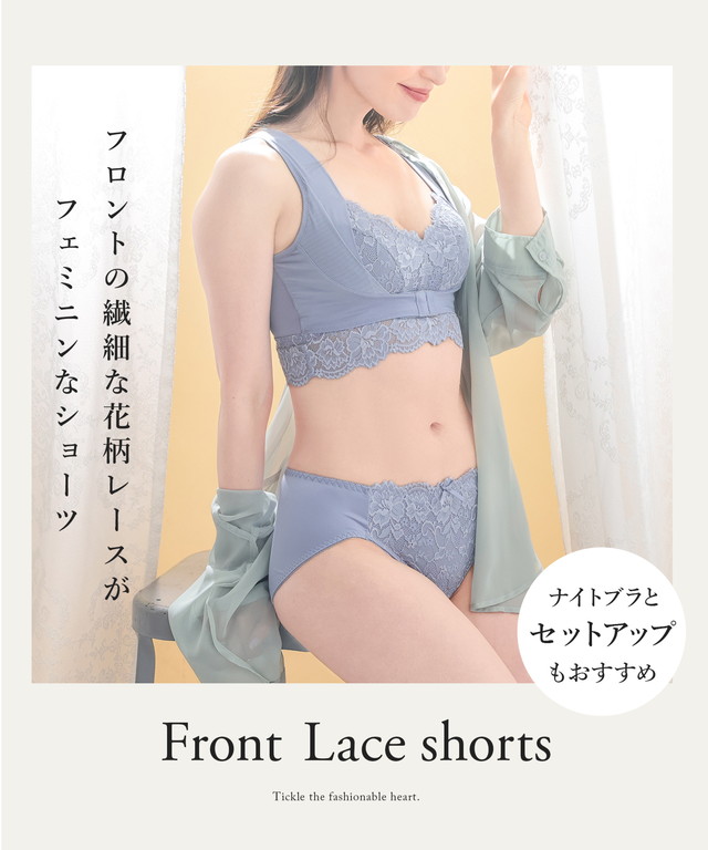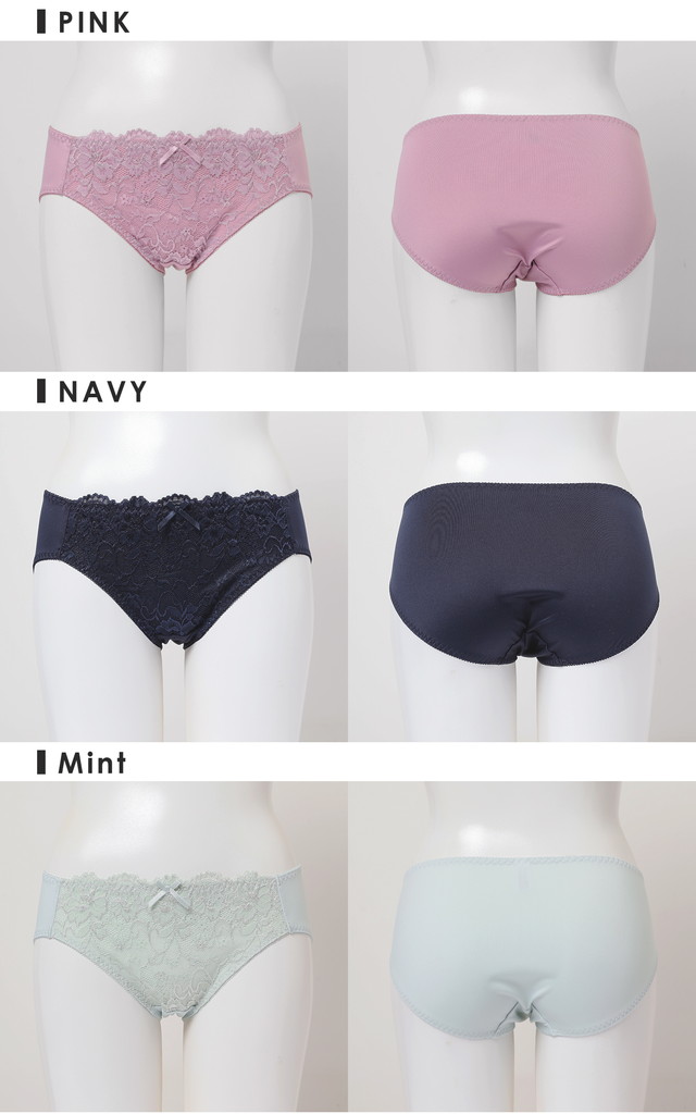 光沢感のあるフロントの花柄レースがフェミニンなショーツ。