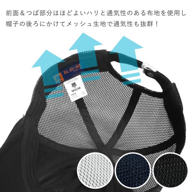 前面&つば部分は布地、帽子の後ろにかけてはメッシュ生地で作られているから通気性抜群!
