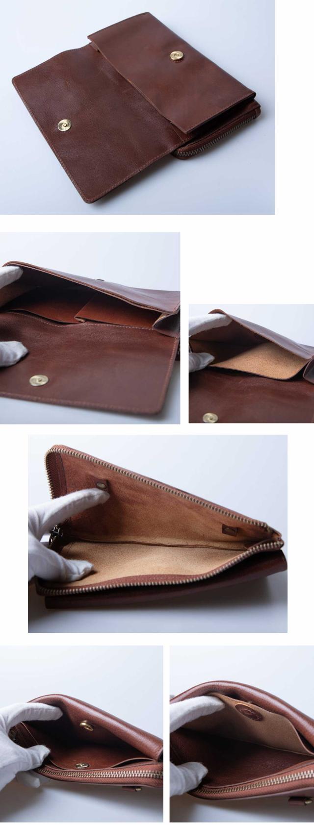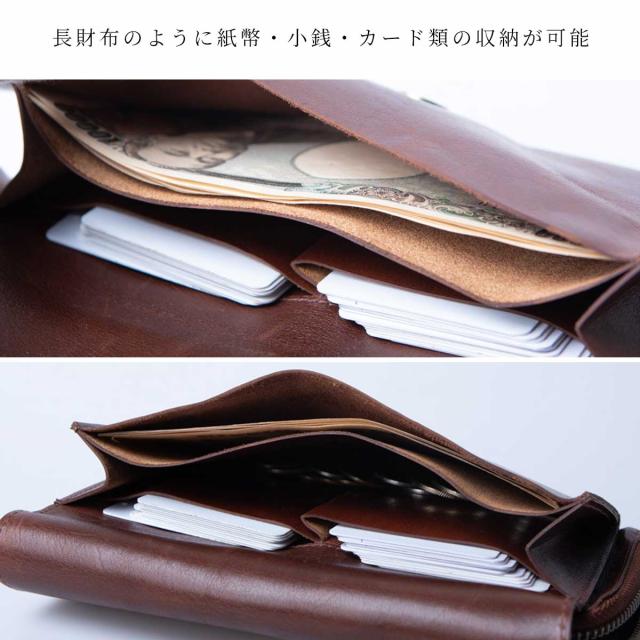 長財布のように現金もフラップポケットが付いた前面は、主に財布としての収納が可能です。それぞれ仕分けられたポケットに紙幣、カード、コインがたっぷりと入ります。