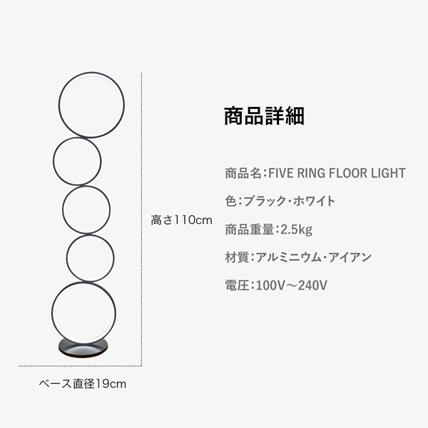 ■商品名 7Life ファイブリングフロアライト ■サイズ ベース直径19cm × 本体高さ110cm ■材質 アルミニウム、アイアン ■商品カラー ブラック ■重量 2.5kg ■光源 LED ■光の色 昼白色、温白色、電球色 ■電圧:100〜240V ■ルーメン 5520-5980LM ■同梱物 本体、ベース、電源アダプター、リモコン ※記載は商品仕様の一部です。仕様説明不足等の理由での返品はできません。特に適合等は必ずご確認ください。