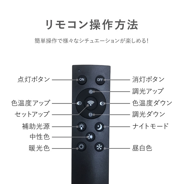 色温度調整:色温度ボタン(アップ・ダウン)は昼白色と暖光色の色温度勾配をお好みで調整できます。