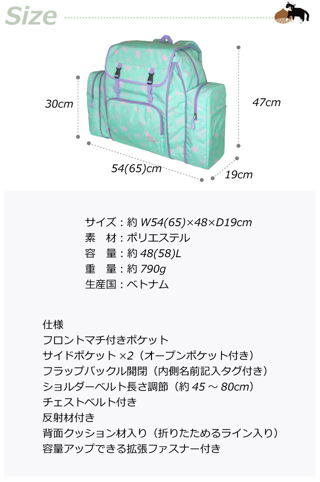![]() ![]() ![]() ![]() ![]() ![]() ・NICE CLAUP ナイスクラップ マロン ネコとりぼんが散りばめられた女の子らしいキュートなデザインのサブリュック。 48〜58Lの大容量サイズ。サイドファスナーを開くとマチが広がり容量がアップします。 名前ラベルはフラップの内側にあり防犯にも。 修学旅行や林間学校・宿泊学習・部活・スポーツ・旅行などにピッタリ!