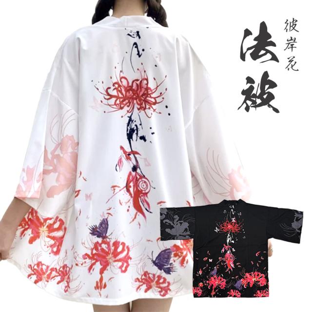 法被 彼岸花と蝶 全2色 ホワイト ブラック 夏祭り 夏恋 寺 韓国ファッション 神社 羽織り 半纏 はんてん ハッピ 長半纏 半天 袢天 半被 お祭り衣装 雅 和柄 ハッピ 羽織 和装 カーディガン 浴衣 着物 はっぴスタイル 風物詩 かっこいい
