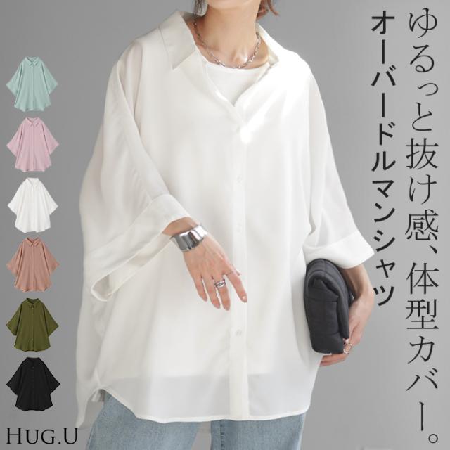 シャツ ドルマン 半袖 トップス 一部4月中旬入荷 レディース ドルマンシャツ ロング ロングシャツ チュニック ブラウス オーバーサイズ ゆったり 体型カバー 薄手 レイヤード 無地 お尻が隠れる 羽織り 上品 きれいめ 大きいサイズ ピンク 黒 白 春 夏 HUG.U 秋新作