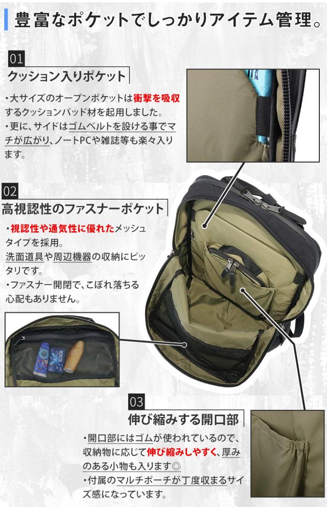 | 備考 | 【メイン開閉】ダブルファスナー 外側/ 前面ファスナーポケット×1(中オープンポケット×1、小オープンポケット×2(メッシュ)、ペン挿し×2、キーフック×1) サイドファスナーポケット×1 オープンポケット×1(アクティブシールド仕様) 前方ルーム/ 小ファスナーポケット×1(メッシュ) オープンポケット×2(1つはクッション入り) 後方ルーム/止水ファスナー タブレット用ポケット×1 付属/ マルチポーチ×1(オープンポケット×1) ・キャリーオン機能 ・持ち手を束ねるホックストラップ付き ・チェストベルト キーワード: A4サイズ B4サイズ 15L 20L 20代 30代 40代 50代 日帰り 短期 ノートPC タブレット 収納 キャリーオン ジム 営業 IT 就職祝い 誕生日 手提げ プレゼント ギフト ラッピング ラッピング無料 メンズ レディース 男性 女性 参考書 シンプル 黒 ブラック ネイビー 紺 タウンユース マルチユース デイリーユース ビジネス ビジカジ ブランド カバートクラシック ポイント消化 ニューバッグワカマツ | ||