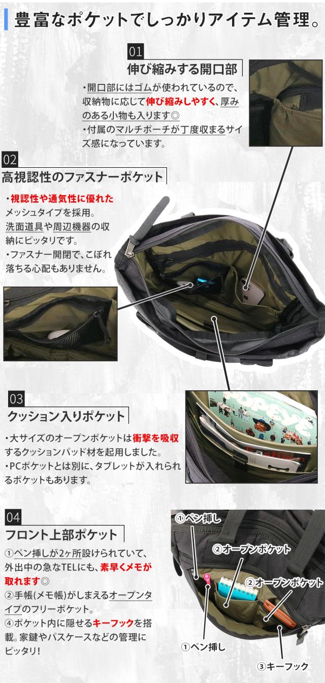 | 備考 | 【メイン開閉】ファスナー 外側/ 大ファスナーポケット×1(オープンポケット×2、ペン挿し×3、キーフック×1) 中ファスナーポケット×1(アクティブシールド仕様) オープンポケット×1 ホックポケット×1 内側/ 大ファスナーポケット×1 小ファスナーポケット×1(メッシュ) オープンポケット×2(1つはクッション入り) タブレット用ポケット×1 付属/ マルチポーチ×1(オープンポケット×1) ショルダーストラップ ・持ち手を束ねるホックストラップ付き キーワード: A4サイズ B4サイズ 10L 15L 20代 30代 40代 50代 日帰り 短期 ノートPC タブレット 収納 ジム 営業 IT 就職祝い 誕生日 手提げ プレゼント ギフト ラッピング ラッピング無料 メンズ レディース 男性 女性 参考書 シンプル 黒 ブラック タウンユース マルチユース デイリーユース ビジネス ビジカジ ブランド ポイント消化 カバートクラシック ニューバッグワカマツ | ||