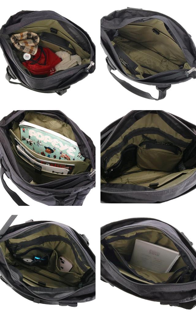 | サイズ(約) ※当店実寸値 | 公式本体サイズ 横34.5cm×縦42cm×マチ12cm 自社採寸本体サイズ 横33cm×縦41cm×マチ11cm 【持ち手高さ】23cm 【持ち手長さ】56cm 【ショルダーストラップ】81〜123.5cm(幅3.5cm、取り外し可能) 【容量】15L 【ノートPC対応サイズ】〜15.5インチ マルチケースサイズ 横21cm×縦15cm×マチ3cm(公式) | ||