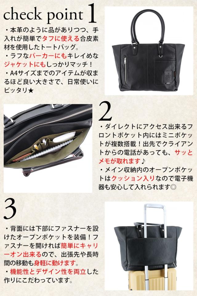 | 備考 | 【メイン開閉】ファスナー 外側/ ファスナーポケット×1 オープンポケット×3(1つは中にオープンポケット×2、ペン挿し×2) ※背面側のオープンポケットは、キャリーオン機能としても使用可能 内側/ ファスナーポケット×1 オープンポケット×1(クッション入り) ■注意 ・摩擦、水濡れ、汗の影響によって色落ちすることがあります。 ・汚れを落とす場合は、水や中性洗剤を使い固く絞った布で拭き取ってください。シンナー、ベンジンなどの有機溶剤の使用は色落ち、変色及びプリントや樹脂加工の剥がれなどの原因になります。 ・ご使用後はよく日陰干しをし、直射日光を避け風通しの良い場所で保管してください。 キーワード: A4サイズ B5サイズ プレゼント ギフト ラッピング ラッピング無料 フェイクレザー デート ドライブ オススメ 記念日 合皮 革ジャン ジャケット 合う オフィス ビジカジ ストリート タウンユース 街 旅行 出張 キャリーオン ブラック 黒 ネイビー 紺 ブラウン 茶 拡張 メンズ レディース 男性 女性 通勤 通学 ビジネス 学生 高校 大学 10代 20代 30代 40代 ユニセックス 男女 兼用 お祝い 無地 ブランド ポイント消化 ニューバッグワカマツ | ||