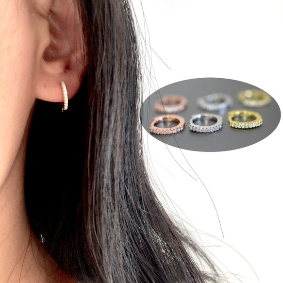 8089 シンプル ミニ フープピアス 細身 中折り ダイヤモンド 軟骨ピアス 軟骨フープピアス ピンクゴールド シルバ