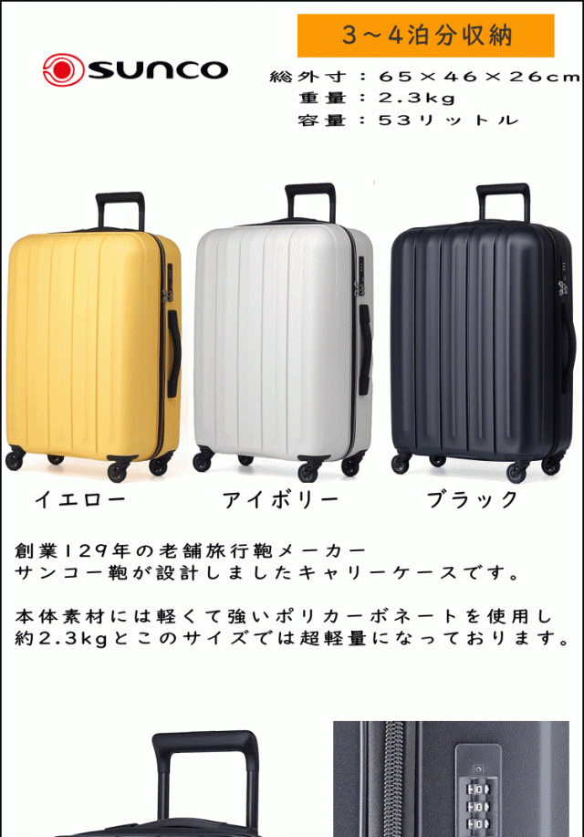 キャリーケース サンコー SUNCO キャリーケース スーツケース キャリーバッグ 軽量 TSAダイヤルロック Sサイズ 2泊 3泊 4泊 SLZ6-58 ブラック イエロー アイボリー 出張 修学旅行 海外旅行