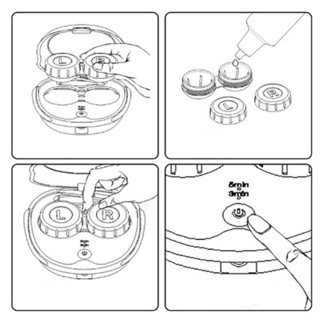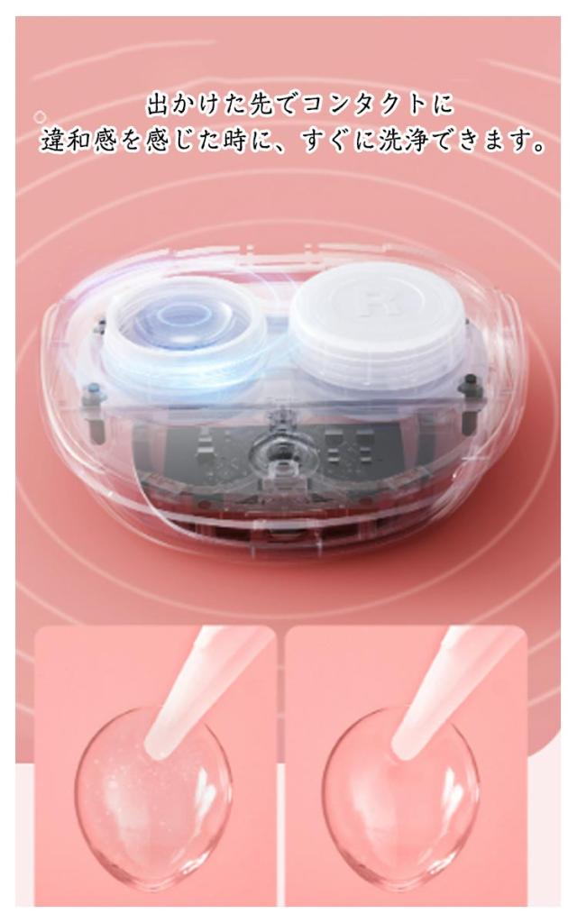 | サイズについての説明 | サイズ:約87mm × 約89mm × 約34mm 重量:68g 内蔵電源:リチウム電池(250mAh) 充電方法:USBケーブル 充電時間:約1時間 動作時間:(1回の充電で60日ほどの使用が可能となります) 【使用方法】 1.洗浄ケースを本体から取り外します。 2.洗浄ケースのキャップを外して、コンタクト用の洗浄液や精製水を注ぎます。 3.キャップを締めて洗浄ケースを本体に戻し、台座にしっかりと固定します。 4.洗浄開始ボタンを押して、自動停止するまで待ちます。 |
